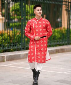Áo dài cách tân nam gấm đỏ cổ tàu họa tiết hình học – nổi bật, sang trọng