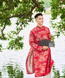 Áo dài cách tân nam gấm đỏ họa tiết sơn thủy cổ tàu – nổi bật, nghệ thuật