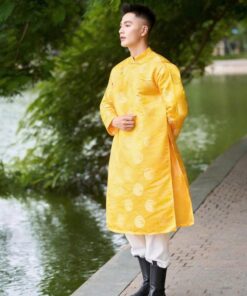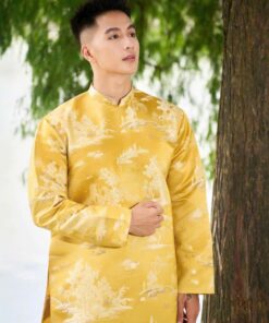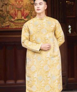 Áo dài cách tân nam gấm vàng họa tiết truyền thống – lịch lãm, sang trọng