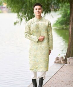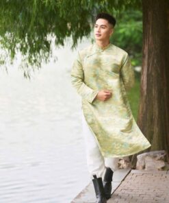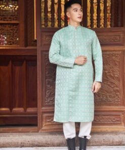 Áo dài cách tân nam gấm xanh ngọc cổ tàu họa tiết dệt chìm – thanh lịch, nhã nhặn