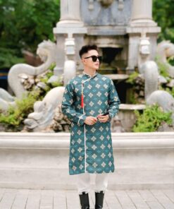 Áo dài cách tân nam gấm xanh cổ vịt họa tiết hình học – nam tính, hiện đại