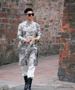 Áo dài cách tân nam họa tiết thủy mặc trắng đen cổ tàu – cá tính, hiện đại