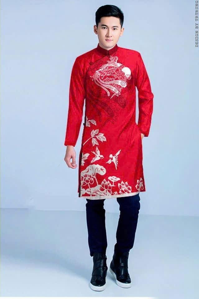 Áo dài cách tân nam đỏ họa tiết long phụng – vượng khí phú quý