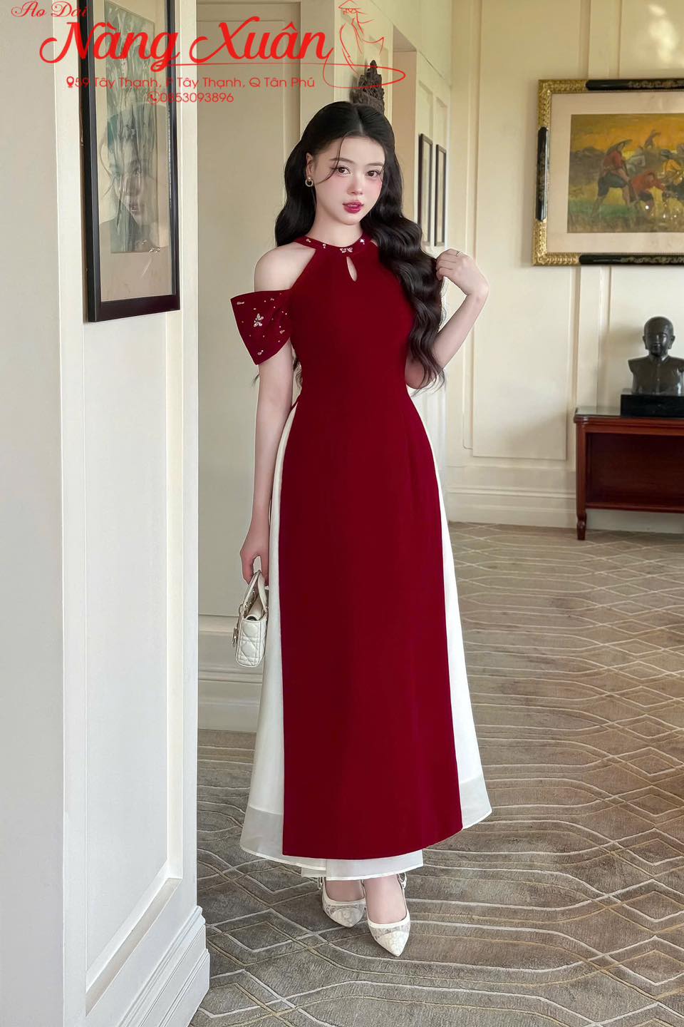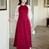 Áo dài cách tân nữ đỏ đô cổ yếm khoét vai – quyến rũ, sang trọng
