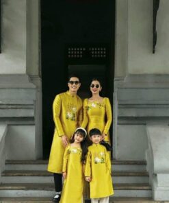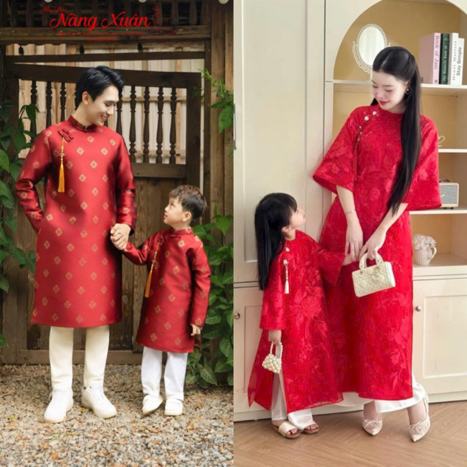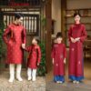 Áo dài gia đình gấm đỏ họa tiết kim cương truyền thống