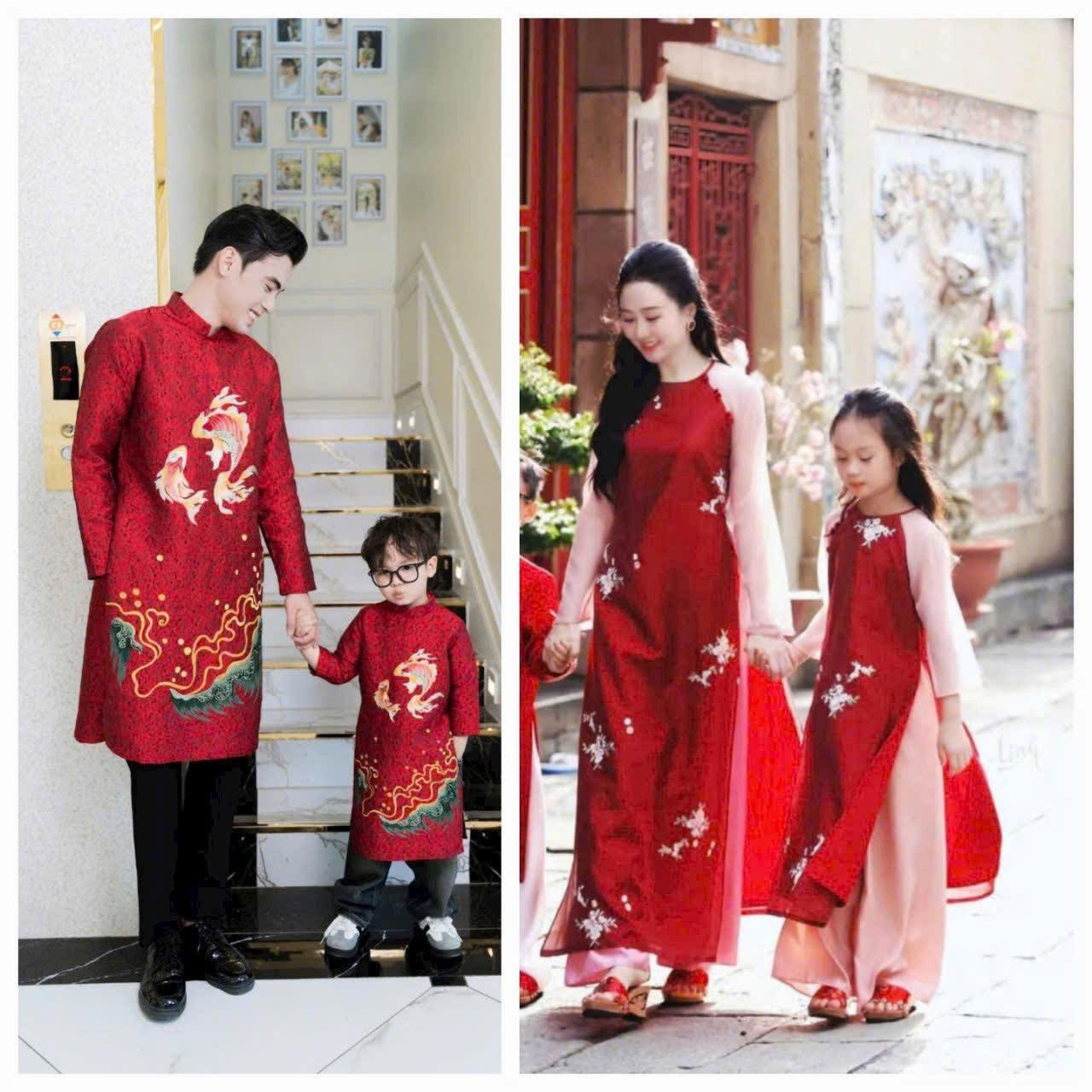 Áo dài gia đình gấm đỏ thêu cá chép – hoa đào truyền thống