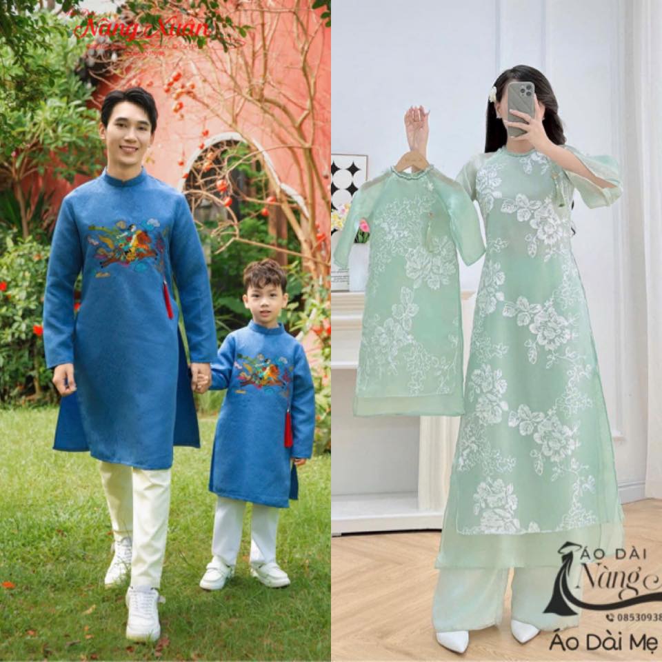Áo dài gia đình gấm phối xanh dương – xanh mint thêu hoa