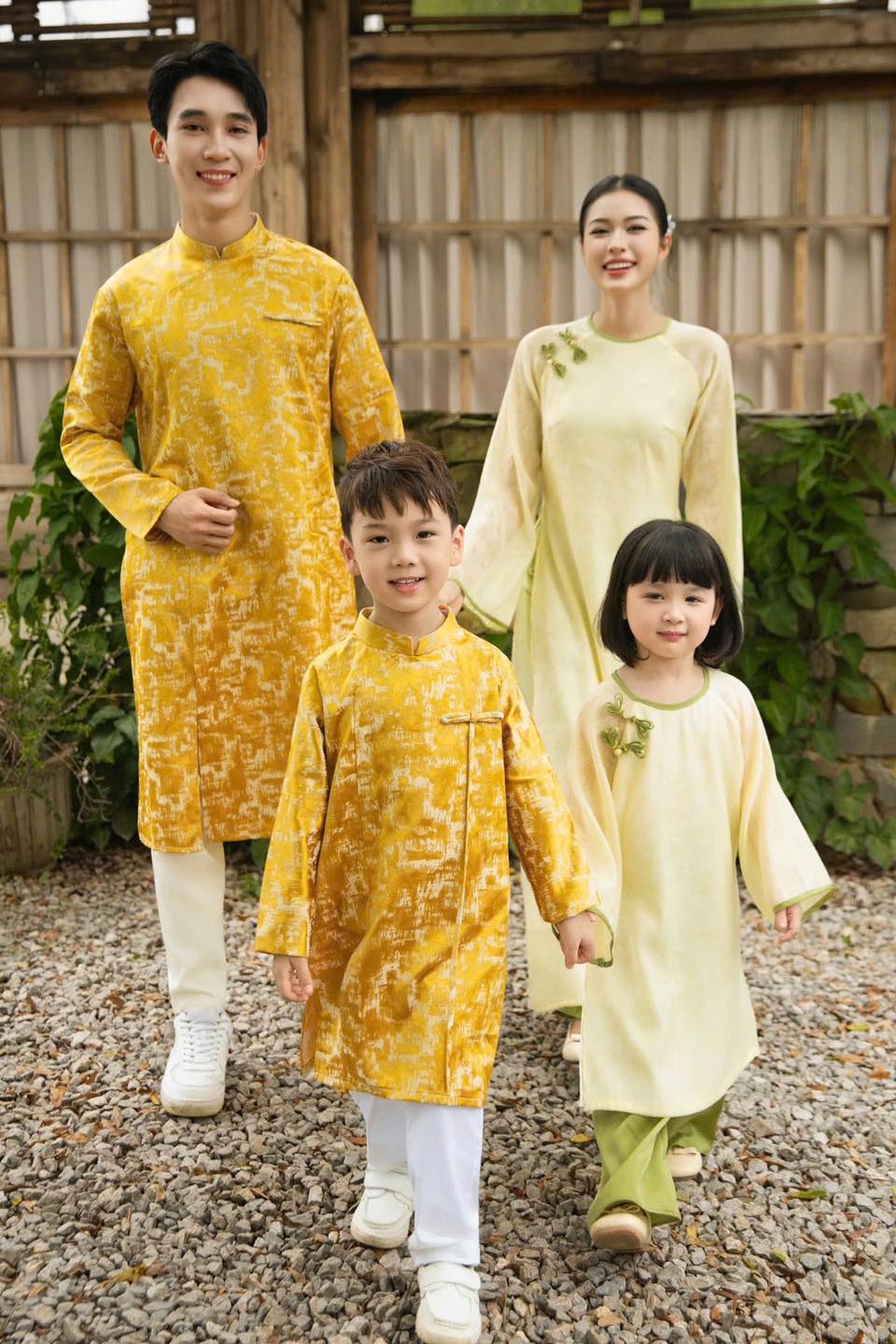 Áo dài gia đình gấm vàng nghệ – phối xanh non thanh lịch
