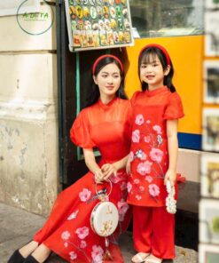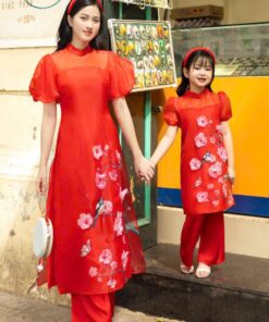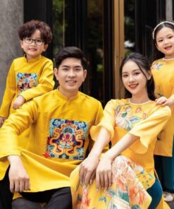 Áo dài gia đình phối xanh ngọc – vàng kem thêu chim hoa