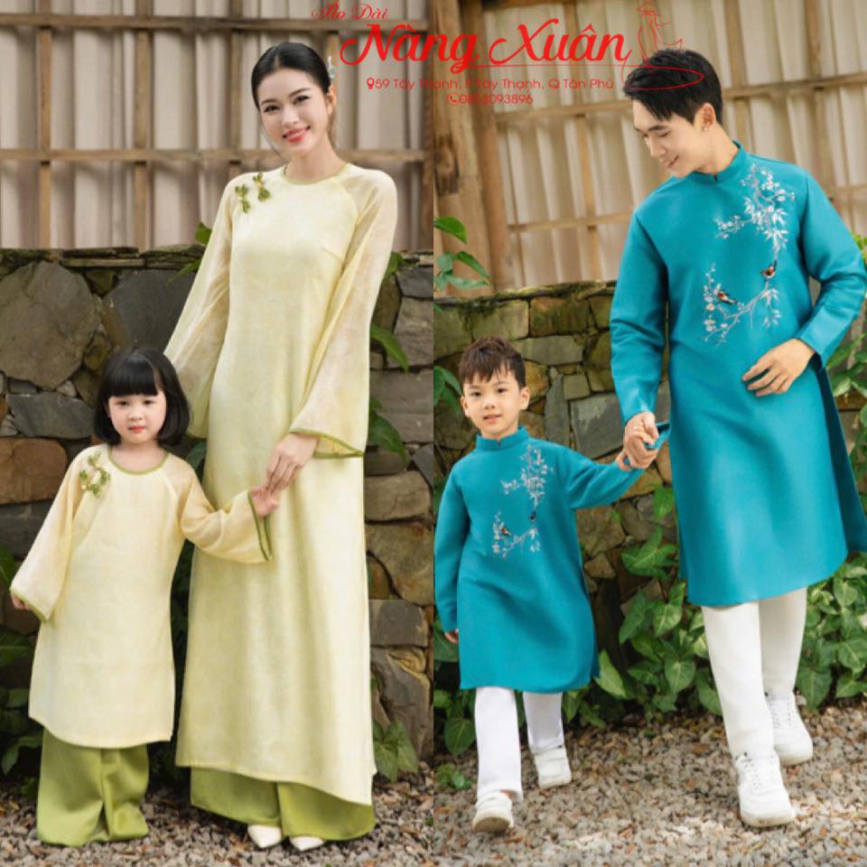 Áo dài gia đình phối xanh ngọc – vàng nhạt thêu chim hoa